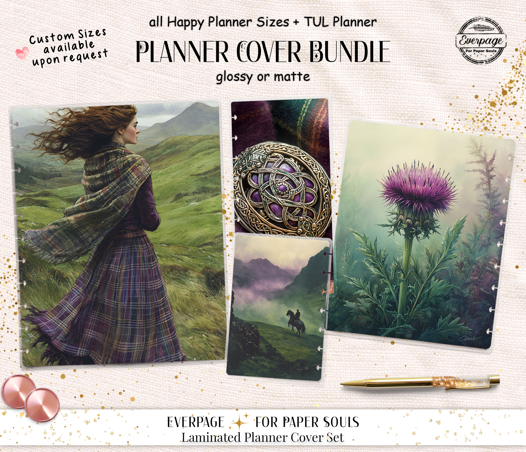 Handcrafted laminated planner covers designed to protect your pages and elevate your planning style.